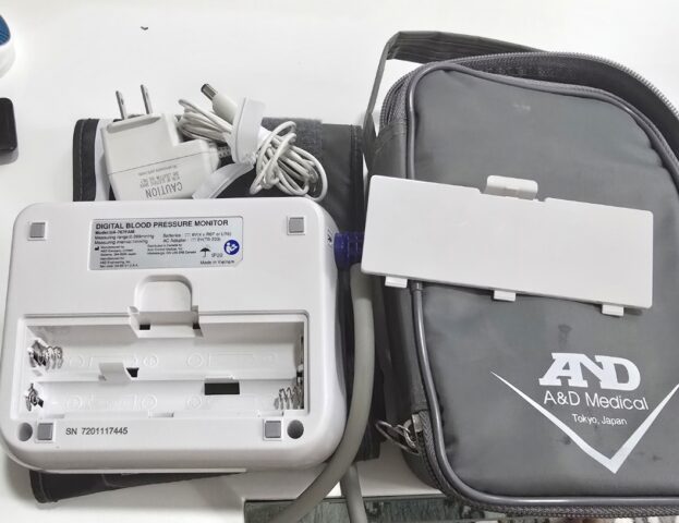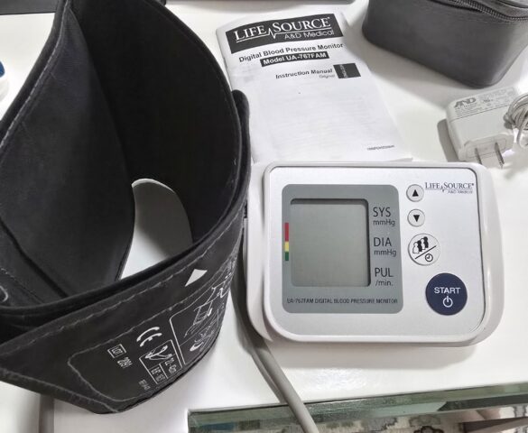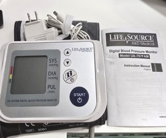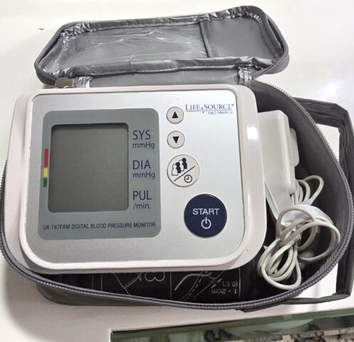 This is a Life Source digital blood pressure monitor, model UA-767FAM. It's a medical device for home use. It comes with an arm cuff that fits arm circumferences of 22-42cm (8.6"-16.5"). Includes the instruction manual and a travel bag.